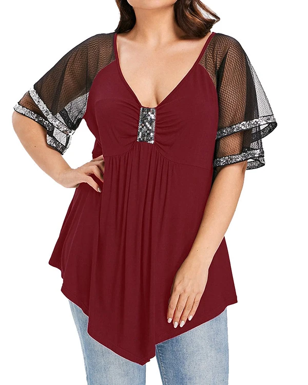 Summer 2022 Women Oversize Blouse V-Neck Lace Shortsleeve Dress Shirt Plus Size Elegant Tops